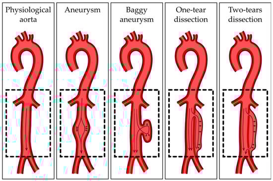 The ascending and descending sections of the aorta differ in origin. The VSMCs of the ascending aorta come from the neural crest, while the cells of the descending aorta are somitic mesoderm-derived [23]. The border between them consists of a potential location of some CVDs, such as the coarctation of the aortic arch, an interrupted aortic arch and aortic arch aneurysm [24]. The differences in the physiology of those sections may also be a reason for the disproportion between TAA and AAA incidence [25]. Due to high blood pressure, dissecting aneurysms are much more common in the thoracic aorta than the abdominal aorta [26]. In the morphology of blood vessels, especially the greatest artery of the body, the appropriate cooperation and functional complementation of the three layers of the aorta are crucial. Disturbances in the communication of aortic layers, like depositions of atherosclerotic plaque between layers, may be one of the factors contributing to the development of AAA. Atherosclerotic plaque consequently reduces the lumen of the vessels and significantly impedes blood flow through it [27]. As a result, AAA may be formed as a reaction to histopathological changes. The narrowing of the aortic lumen causes compensatory changes in the aortic wall, and consequently, ECM remodeling occurs to normalize the vessel lumen diameter. Rapidly occurring remodeling significantly reduces the organized structure of individual layers, weakening the strength and elasticity of the vessels [28]. However, further research is needed regarding the above relationship. Aortic layers differ in function, which is the consequence of morphological and cellular structure. However, the middle layer is the part with the most complex structure, containing a thick layer of VSMCs and a high elastine/collagen ratio [29]. Mature VSMCs are responsible for maintaining the circumference morphology of the aortic wall. Their elongated shape, which is characteristic for muscle tissue, allows the vessel to expand elastically, but it also can adapt to environmental stimuli and mechanical stress. Phenotype switch allows the VSMCs to go from contractile to synthetic, which is crucial in remodeling but contributes to vascular diseases when uncontrolled [30]. Contractile VSMCs support the contractile properties of the aortic wall and secrete specific muscle markers, as alpha smooth muscle actin (αSMA), smooth muscle 22α (SM22α) and calponin [31]. Synthetic VSMCs are more proliferative and migratory and synthetize a significant number of structural proteins. The elastine/collagen ratio increases in the proximal parts of the aorta to withstand high outlet blood pressure and decreases in the distal part, and the ratio diminishes, showing an increase in collagen [32]. Intima layer physiology is maintained by ECs. The cells prevent platelet activation, leukocyte adherence and blood clotting, though expressing factors like nitric oxide (NO) or prostacyclin (PGI2) [33]. Activated by inflammatory stimuli, ECs upregulate cellular adhesion molecules, including vascular cell adhesion molecule (VCAM) and intercellular adhesion molecule (ICAM), triggering leukocyte deposit on the endothelial surface [34]. The integrity and strength of the intima layer is crucial to maintaining the physiology of the circulatory system, which is also due to mechanical damages. Its interruption results in aortic dissection, during which blood flows between the layers of the aortic wall, as shown in Figure 2.