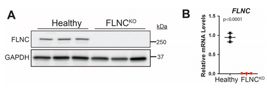 Homozygous knockout (KO) of Flnc in mice is postnatally lethal [12,13]. Our previous study showed that the transcriptional changes, caused by FLNC homozygous deletion in human pluripotent stem cell-derived cardiomyocytes (hiPSC-CMs), are highly comparable to the transcriptome of hiPSC-CMs from patients with FLNC truncating mutations [9]. Thus, FLNC homozygous knockout (FLNCKO) hiPSC-CMs represent an appropriate human cell model with which to study FLNC biology in the heart and the effects of loss-of-function (LoF) mutations in FLNC cardiomyopathy.