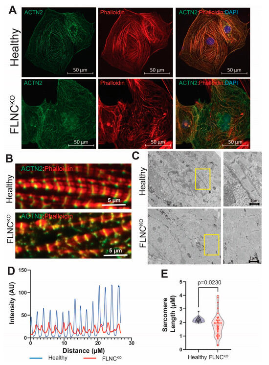 The expression levels of FLNC were significantly reduced in FLNCKO hiPSC-CMs for both protein and mRNA levels, as detected by immunoblot (IB) analysis and qPCR (Figure 2A,B). We performed immunofluorescence (IF) analysis of actin filaments (F-actin), including both cytoskeleton and sarcomeric thin filaments, using phalloidin and α-actinin (ACTN2, a marker of Z-disc protein and stabilizer of the actin filaments in FA). IF analysis showed actin cytoskeleton disorganization to be associated with an aberrant sarcomere structure in FLNCKO iPSC-CMs (Figure 3A,B). In particular, F-actin and ACTN2 appeared to accumulate in regions where α-actinin was absent. The disruption of the spatial distribution pattern of F-actin and ACTN2 in the FLNCKO hiPSC-CMs suggested reduced crosslinking of the thin filaments of actin to ACTN2, leading to the breakage of actin bundles and disarrangement of protein interactions in the Z-discs. We also confirmed the abnormal structure of the sarcomeres via transmission electron microscopy (TEM), as shown in Figure 3C. The Z-lines in the control hiPSC-CMs appeared as fine dense lines forming defined sarcomere boundaries; conversely, in the FLNCKO hiPSC-CMs, the Z-lines were thinner and interrupted in numerous points. Fluorescent signal analysis using fast Flourier transformation (FFT) showed decreased fluorescent intensity and irregular spacing of ACTN2 in FLNCKO hiPSC-CMs compared to isogenic control hiPSC-CMs (Figure 3D). Also, a significantly wider distribution of sarcomere length (0.2892–3.684 μm vs. 1.948–2.824 μm), with a mean of 1.808 ± 0.8293 vs. 2.202 ± 0.187, was observed in FLNCKO cardiomyocytes compared to controls (Figure 3E). The elongated sarcomere resembled the structural elongation of CMs observed in eccentric hypertrophy. Taken together, the data support the hypothesis that FLNC deficiency causes F-actin mislocalization and the loss of actin-actinin crosslinking, hindering thin filament formation in hiPSC-CMs.