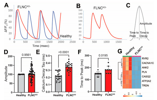 Calcium (Ca2+) handling abnormalities in FLNC-deficient cardiomyocytes. (A) Calcium handling dysregulations in FLNCKO compared to isogenic control iPSC-CMs. (B) Early afterdepolarizations in FLNCKO iPSC-CMs. (C) Illustration of calcium transient curve. (D) Calcium transient amplitude. (E) Calcium decay time. (F) Time to peak. (G) Calcium handling genes heatmap.
