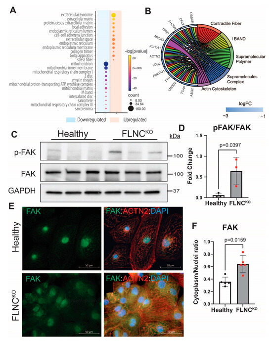 FAK activation in FLNCKO hiPSC-CMs. (A) GO cellular component analysis in FLNC knockout and isogenic control iPSC-CMs shows the activation of focal adhesion signaling pathway (hsa04510). (B) Downregulation of genes involved in sarcomere cytoskeleton formation in FLNCKO iPSC-CMs. (C) Increased expression levels of p-FAK (Y397) in FLNCKO compared to wildtype iPSC-CMs as assessed by IB. (D) Quantitative representation of the blots in B. (E) IF stanning of FAK in FLNCKO compared to isogenic control iPSC-CMs. (F) Quantitative representation of the fluorescence signal of FAK in cytoplasm and nucleus.