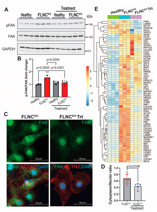 Proteins were extracted from isogenic control and FLNCKO-/- iPSC-CMs with RIPA buffer (Life Technology, Carlsbad, CA, USA) [9]. Proteins were separated on polyacrylamide gels, and transferred to PVDF membranes (Millipore, Burlington, MA, USA). Membranes were blocked with 5% nonfat milk in TBS-T (Tris-buffered saline, 0.1% Tween 20) at room temperature for 1 h. For protein detection, Phospho-Akt (Ser473) (Cell Signaling, Danvers, MA, USA, Cat#4060, dilution 1:1000), Akt (Cell Signaling, Cat#9272, dilution 1:1000), Phospho-FAK (Tyr397) (Cell Signaling; dilution 1:1000), FAK (Proteintech, Cat#12636-1-AP, dilution 1:1000), and GAPDH (Thermo Fisher Scientific, Cat#AM4300, dilution 1:8000) were used. Membranes were then incubated with horseradish peroxidase-conjugated secondary antibodies and signals were developed using an enhanced chemiluminescence substrate (Thermo Fisher Scientific, Waltham, MA, USA).