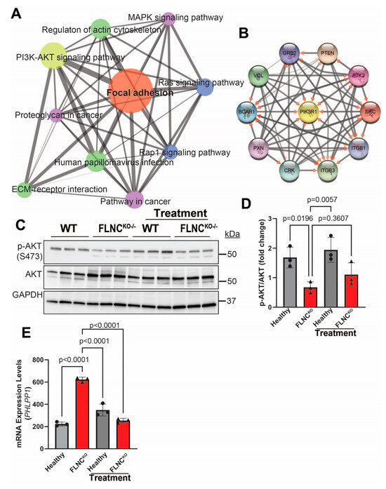 Suppression of AKT signaling in FLNCKO iPSC-CMs. (A) Enrichment of PI3K-AKT signaling pathway, MAPK signaling (p = 3.09 × 10−80) pathway, and actin cytoskeleton DEGs in FLNCKO compared to isogenic control iPSC-CMs. (B) The molecular interaction network analysis revealed PIK3 kinase regulatory subunit 1 (PI3KR1) to be the core molecule. (C) Immunoblots showed decreased p-AKT expression levels in FLNCKO iPSC-CMs compared to isogenic control iPSC-CMs; total AKT expression levels were also significantly increased compared to isogenic control iPSC-CMs. (D) Quantitative representation of immunoblots in C. (E) PHLPP1 mRNA was increased in FLNCKO compared to healthy hiPSC-CMs, and treatment with crenolanib significantly downregulates PHLPP1 mRNA levels. All experiments were independently repeated three times.