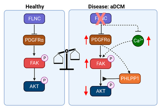 In conclusion, our findings suggest that the complete loss of FLNC in cardiomyocytes leads to cytoskeletal and sarcomeric defects, calcium handling dysregulation, and the activation of focal adhesion kinase. Moreover, our findings show that inactivation of AKT signaling contributes to the pathogenesis of FLNC cardiomyopathy. The inhibition of PDGFRA signaling using crenolanib reduces FAK activation and partially normalizes differentially expressed genes in FA signaling pathways, suggesting that the repurposing of crenolanib may be an effective treatment in FLNC cardiomyopathy.
