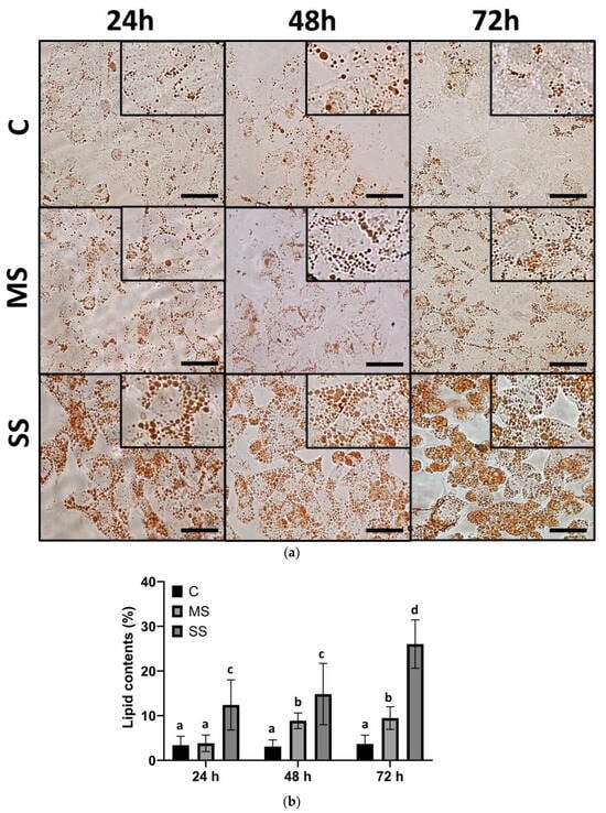 The HepG2 cells cultured in steatogenic conditions showed a significant increase in intracellular lipid contents (Figure 1a). MS induced a two-fold increase in intracellular fat at both 48 and 72 h compared with the control condition. SS induced a three-fold increase in fat content at 24 and 48 h and an almost five-fold increase at 72 h compared with the control (Figure 1b). The LX-2 cells incubated in steatogenic conditions did not show lipid staining with Oil Red.