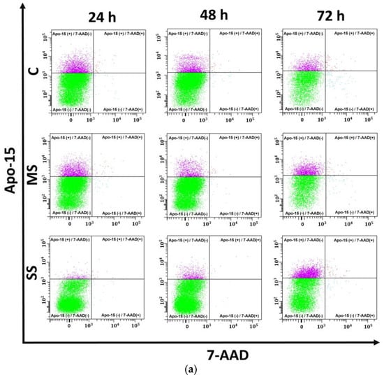 HepG2 cells showed increased cell death, identified as early apoptosis, in the MS group at 72 h compared with C and MS at 24 and 48 h. SS early apoptosis was significantly lower at 24 h compared with C and MS. Although the Apo15+/7AAD- HepG2 cells had increased by 72 h in SS compared with SS at 24 h, the percentage early apoptosis remained significantly lower compared with those of C and MS (Figure 3a,c). Thus, mild steatosis increases apoptosis, whereas severe steatosis reduces this type of cell death, suggesting that severe steatosis might induce a different type of cell death. No differences in late apoptosis (Apo15+/7AAD+ cells) or necrosis (Apo15-/7AAD+ cells) were observed in hepatocytes (Figure 3a).