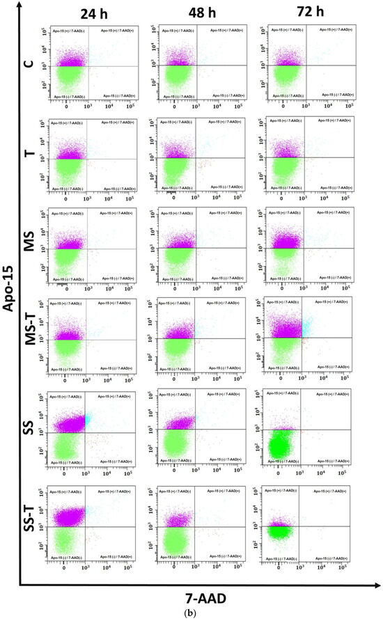 Regarding LX-2 cells, apoptosis decreased slightly with the incubation time in C and T cells. Exposure to steatogenic conditions produced differential effects related to both the time and severity of the steatogenic input. MS and MS-T significantly increased apoptosis, showing 57.67 ± 8.35% apoptotic cells in MS and 52.93 ± 1.37 in MS-T at 72 h, whereas SS and SS-T increased apoptosis at 24 h, showing 50.77 ± 9.52% in SS and 69.43 ± 3.50 in SS-T (Figure 3b,d). This is a plausible explanation for the low proliferation and viability observed in SS and SS-T. The percentage of late apoptosis (Apo15+/7AAD+) decreased in SS versus MS at 72 h (MS = 0.50 ± 0.10 and SS = 0.08 ± 0.03; p < 0.01; Figure 3b). No differences in necrosis (Apo15-/7AAD+) were observed in LX-2 cells (Figure 3b).