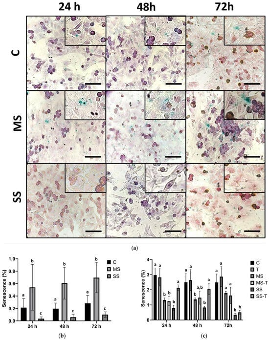 On the other hand, senescence in LX-2 cells maintained a steady state during the incubation period under both C and T conditions. In MS, the senescence was low at 24 and 48 h, but it recovered to control levels by 72 h. Similarly, in MS-T, the senescence was low at 24 h; however, it recovered to control and T levels from 48 h. This suggests that TGF-β stimulation produces another cellular fate in MS, likely proliferation (as shown in Figure 2d). In SS, the senescence remained low regardless of the incubation time, probably due to increased cell death. SS-T only showed low senescence levels by 72 h, suggesting that HSCs exposed to high lipid contents are partially protected by TGF-β, but for a shorter time than HSCs under mild steatosis (Figure 4c,d).