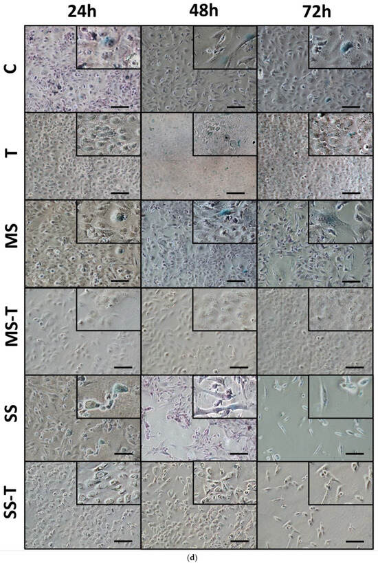 Senescence-associated beta-galactosidase (SA-βgal) was detected with the Senescence Detection Kit (Abcam, MA, USA) in cells cultured on coverslips for every treatment and exposure time. The cells were fixed with 500 µL of a fixative solution for 15 min at room temperature. The cells were washed twice in 1 mL of 1X PBS, and 500 µL of the staining solution mix was added to each well. The plates were sealed and introduced into a hermetic bag, extracting all air to avoid the effect of atmospheric CO2 on the pH inside the wells. The plates were incubated overnight at 37 °C. A blue color developed in senescent cells, and counterstaining was performed with hematoxylin. A morphometric assessment was performed in 10 digitalized optic fields per well and analyzed using ImageJ v.1.53c.