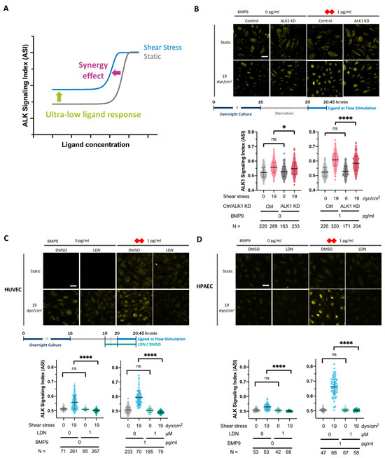 Interactions between SS and the ALK1 ligand occur at lower magnitudes and concentrations, respectively (Figure 4A), than previously described [26]. The ligand/flow synergy effect represents a phenomenon whereby even very low magnitude SS dramatically enhances EC sensitivity to and lowers the EC50 of all known ALK1 ligands, as discussed in Section 3.2 and Section 3.3. The sub-femtomolar ligand response represents an interaction between SS and trace levels of ALK1 ligand, as discussed in Section 3.4. We next wanted to determine whether the sub-femtomolar ligand response (0 pg/mL BMP9) and the ligand/flow synergy effect (1 pg/mL BMP9) were dependent on ALK1 (Figure 4A). Accordingly, we knocked down ALK1 in HUVECs (ALK1-KD) using lentiviral-transduced ALK1 shRNA, incubated KD and control cells either without added ligand or with BMP9, and analyzed ASI under static or 19 dyn/cm2 SS conditions. We achieved 80 to 90% ALK1 mRNA knockdown and ~65% ALK1 protein knockdown by 6 days post-transduction (Supplementary Figure S3). With ALK1-KD, the flow response was significantly blunted without (left) and with added ligand (right), demonstrating that both the sub-femtomolar ligand response and ligand/flow synergy effect depend on the ALK1 receptor (Figure 4B).