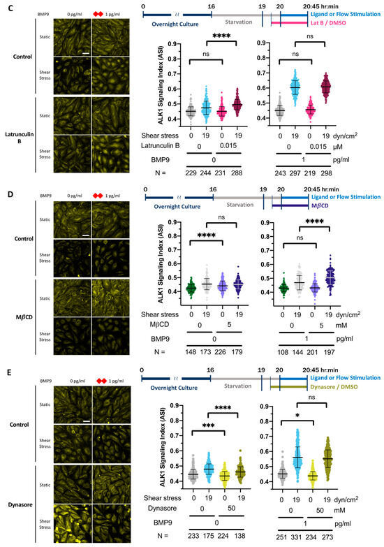 3.6. Requirements for Mechanosensing in the Flow-ALK1 Ligand Synergy Effect