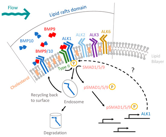 SS stimulation is also thought to enhance the ligand-dependent activity of activin receptor-like kinase 1 (ALK1). ALK1 is one of seven TGF family type I receptor serine/threonine kinases; it is the only type I receptor that strongly binds circulating ligands bone morphogenetic protein 9 (BMP9) and BMP10. Ligand binding brings together a heterotetrameric complex at the plasma membrane containing two ALK1 and two type II receptors, allowing the type II receptors to phosphorylate and activate ALK1. ALK1 then phosphorylates receptor-specific (r-) SMADs: SMAD1, SMAD5, and/or SMAD9 (hereafter, SMAD1/5/9). Two phosphorylated r-SMAD molecules complex with one molecule of the common partner, SMAD4, and the complex subsequently undergoes nuclear localization and acts as a transcription factor [17,18,19,20,21]. Type I receptors ALK2, ALK3, and ALK6 bind alternative BMPs but similar to ALK1, they phosphorylate SMAD1/5/9 [22].