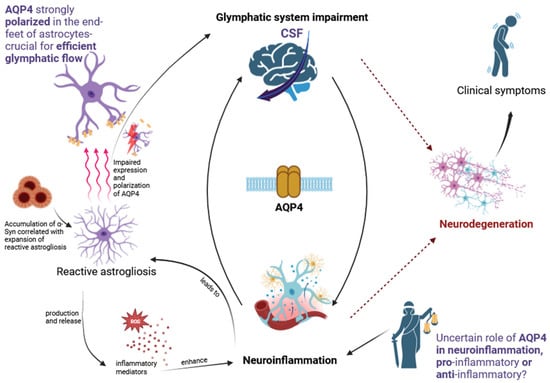 It appears that AQP4 is a significant common component in the processes of neuroinflammation and glymphatic clearance. In this context, a particularly important issue is reactive astrogliosis, which is linked to neuroinflammation and could potentially affect the efficiency of glymphatic clearance through the negative impact of AQP4 polarization. The expansion of reactive astrogliosis may be influenced by the accumulation of αSyn, which is intrinsically linked to the process of neurodegeneration and is also subject to glymphatic clearance. The role of AQP4 in neuroinflammation remains a matter of debate. The pro-inflammatory and anti-inflammatory nature of this protein has been subject to conflicting opinions. Nonetheless, there is no ambiguity regarding its significant impact on inflammatory processes and its pivotal role in the glymphatic system, rendering AQP4 a promising target for further investigation and a potential avenue for therapeutic interventions.