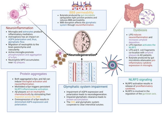 In conclusion, neuroinflammation and impaired glymphatic system function contribute to the progression of neurodegenerative disorders and appear to be important factors in their etiology. Protein aggregates are characteristic features of neurodegeneration, and are correlated with glymphatic clearance and neuroinflammation. Astrocytes also play a crucial role in inflammatory responses in the central nervous system and are essential for the effective functioning of the glymphatic system. The gut–brain axis and microbiome may impact the neuroinflammatory and neurodegenerative processes.