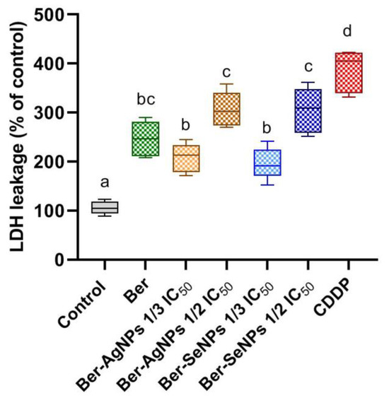 Lactate dehydrogenase (LDH) activity in HepG2 cells after 24 h of incubation with berberine and its nanoderivatives (Ber-AgNPs and Ber-SeNPs). Data were presented as (mean ± SD) from three separate experiments. Different letters indicate statistically significant differences at p < 0.05. Ber, berberine; CDDP, cisplatin.