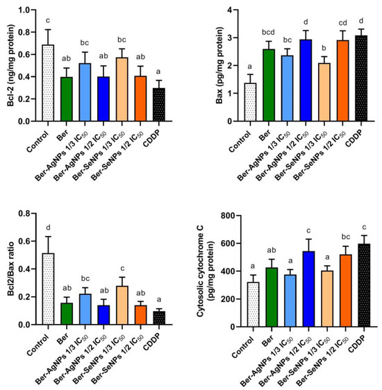 Changes in the levels of the regulatory apoptotic proteins Bcl-2, Bax, and cytochrome C in HepG2 cell lines after 24 h of treatment with berberine and its nanoderivatives. Data are presented as the mean ± SD from three separate experiments. Different letters indicate statistically significant differences at p < 0.05. Ber, berberine; CDDP, cisplatin.