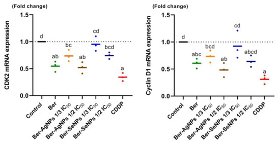 Changes in levels of the cyclin D1 and CDK-2 mRNA expression patterns in HepG2 cell lines after 24 h of treatment with berberine and its nanoderivatives. Data are presented as the mean ± SD of three separate experiments. Different letters indicate statistically significant differences at p < 0.05. Ber, berberine; CDDP, cisplatin.