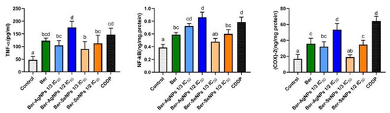 Changes in TNF-α, NF-κB, and COX-2 levels of HepG2 cells after 24 h of treatment with berberine and its nanoderivatives. Data are presented as the mean ± SD from three separate experiments. Different letters indicate statistically significant differences at p < 0.05. Ber, berberine; CDDP, cisplatin.