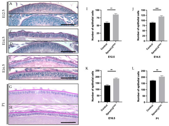 When examining the epithelium of the Spred-deficient lenses, there was an evident disruption to its native monolayer, with epithelial cells appearing multi-layered/pseudostratified throughout development (Figure 3). Although this lens epithelial phenotype was more pronounced at earlier developmental stages, i.e., E12.5 (Figure 3B) and E14.5 (Figure 3D), it still remained apparent at E16.5 (Figure 3F) and P1 (Figure 3H). Unlike the recovery of the small lens size with age, the lens epithelial phenotype persisted, correlating with a significant increase in epithelial cell density.