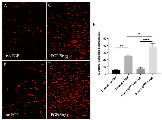 BrdU incorporation of proliferating lens epithelial cells of transgenic and control mice explants at P10. Lens epithelial explants of control (A,C) and Spred1/2CKO (B,D) explants were immunolabeled for BrdU (red cells) and were cultured 24 h in vitro. Lens explants were treated either without FGF (controls; (A,B) or with a low proliferating dose (5 ng/mL) of FGF2 (C,D). Quantitative analysis of cell proliferation was calculated by dividing the number of BrdU incorporated cells (red) by the total number of cells. Mean epithelial cell proliferation (E) of control explants without and with FGF2 was 5.6% ± 0.39 (n = 3) and 25.4% ± 0.22 (n = 3), respectively. In the Spred1/2CKO mice with and without FGF, this was 7.6% ± 1.8 (n = 3) and 38.8% ± 4.4 (n = 3), respectively. Cell proliferation was significantly different between the control explants with and without FGF addition (p = 0.0017 **), between Spred1/2CKO explants with and without FGF addition (p ≤ 0.0001 ****), as well as between the control and Spred1/2CKO explants both treated with FGF (p = 0.0170 *). Ordinary one-way ANOVA * p < 0.05, ** p < 0.01, **** p < 0.0001, error bars represent SEM. Scale bar 50 µm.
