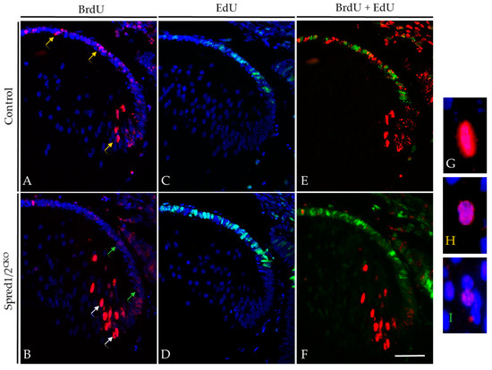 BrdU tracer assay and EdU incorporation in transgenic mice lens at E12.5 + 2. Control (A,C,E) and Spred1/2CKO lenses (B,D,F) at E12.5 + 2 were double-immunolabeled for BrdU (red) and EdU (green) incorporated cells. Differentiating cells were traced over 2 days with BrdU, and proliferating cells were tagged 1 h prior with EdU in both control (A,C) and Spred1/2CKO lenses (B,D). When merged, control (E) tissue displayed a more even distribution of BrdU incorporated cells, with a moderate level of proliferation, indicated by the EdU incorporated cells. Alternatively, the Spred1/2CKO lens (F) had an uneven distribution. The Spred1/2CKO lenses showed BrdU incorporated cells to be primarily in the fiber cell region, with a large population of proliferating cells in the epithelium. White arrows indicate a strong BrdU label, as seen in (G), yellow arrows indicate medium BrdU intensity, as seen in (H), and green arrows indicate a weak BrdU label, seen in (I). Scale represents 50 µm.