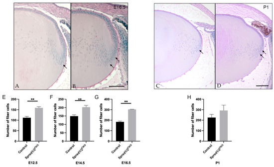 Representative mid-sagittal sections of the fiber cell regions of control and transgenic mice lenses stained with periodic-acid Schiff stain. The fiber cell region had a higher cell density in the Spred1/2CKO (B,D) mice lens (E16.5 and P1 shown) when compared to control (A,C), particularly in the bowzone region and newly formed fiber cell region (indicated by arrows). Quantitative analysis of the number of fiber cells of mid-sagittal sections was collated. The average number of fiber cells was as follows: at E12.5 (E), control 112 ± 6.49 (n = 6) and Spred1/2CKO 158 ± 2.71 (n = 6, p = 0.0022); at E14.5 (F), control 149 ± 7.92 (n = 6) and Spred1/2CKO 203 ± 10.42 (n = 9; p = 0.0028); at E16.5 (G), control 184 ± 8.258 (n = 6) and Spred1/2CKO 303 ± 1.095 (n = 6; p = 0.0022). Postnatally (H), there was no significant difference in the fiber cell numbers between control (225 ± 30.25, n = 9) and Spred1/2CKO lenses (292.7 ± 50.71, n = 7). (Mann–Whitney U test ** p < 0.01, error bars represent SEM, scale bars 100 µm.