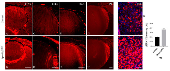 Immunolabeling for pERK in transgenic mice lens at E12.5, E14.5, E16.5, and P1. pERK immunoreactivity was investigated in control (A,C,E,G,I) and Spred1/2CKO mice lenses (B,D,F,H,J). Spred1/2CKO showed significantly increased levels of pERK, particularly in the germinative and transitional regions at ages E12.5 (B) and E14.5 (D), when compared to control ((A,C) respectively). At E16.5 and P1, Spred1/2CKO tissue (F,H) had increased levels, particularly in the transitional and newly forming primary fiber cell regions, when compared to control lens (E,G). P10 epithelial explants shows a singificant increase in pERK expression in Spred1/2CKO explants (J) when compared to control (I). (K) Quantitative analysis confirms this observation, with Spred1/2CKO lenses exhibiting higher pERK1/2 levels (36.71 ± 2.42 AU, n = 5) compared to controls (20.30 ± 1.92 AU, n = 5; p = 0.0079), Mann–Whitney U test, AU—arbitrary units; error bars represent SEM. Scale bars, 50 μm.
