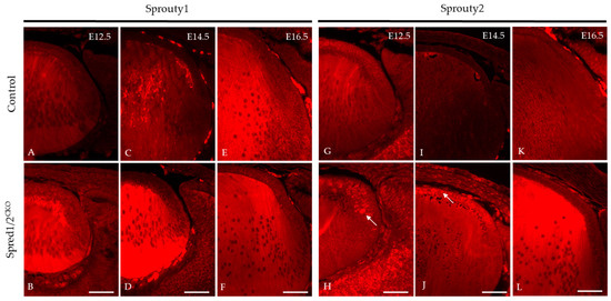 We investigated other related ERK/MAPK antagonists found in the lens, namely, Sprouty1 and Sprouty2, to determine whether there was any putative compensatory relationship with the absence of Spreds, accounting for the postnatal recovery of the mutant lens phenotype. Immunoreactivity for Sprouty1 (Figure 11A–F) was seen throughout the whole lens. The Spred1/2CKO lens showed a marked increase in levels of Sprouty1, particularly in the fiber cells at E12.5 (Figure 11B) and E14.5 (Figure 11D), compared to the control lens (Figure 11A,C). At E16.5, the levels of Sprouty1 in the Spred1/2CKO lens (Figure 11F) appeared to be similar and more consistent with the control lens (Figure 11E). Sprouty2 immunoreactivity, like that for Sprouty1, was also observed throughout the whole lens (Figure 11). The Spred1/2CKO lens showed markedly increased levels of Sprouty2, particularly in the epithelium at E12.5 (Figure 11H) and E14.5 (Figure 11J), when compared to the control lens (Figure 11G,I). By E16.5, the levels of Sprouty2 in the Spred1/2CKO lens (Figure 11L) appeared to be relatively increased in the fiber cell region when compared to the control lens (Figure 11K).