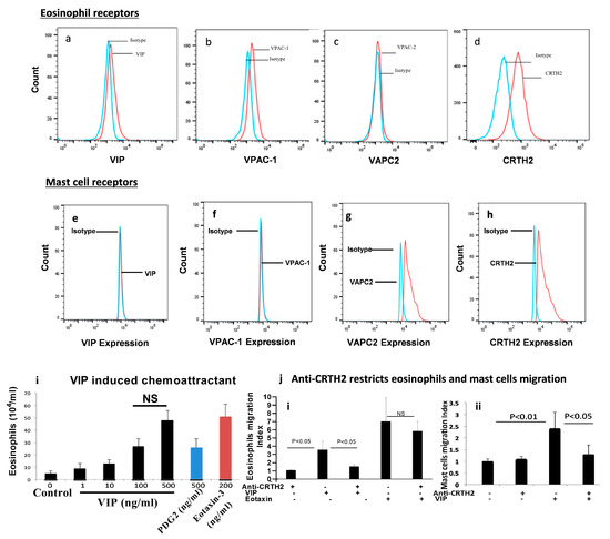 Analysis of VIP and VIP receptors VPAC-1, VPAC-2, and CRTH2 receptors on human blood eosinophils and in vitro-generated mast cells and their migration in response to VIP. Anti-VIP, anti-VAPC1, anti-VACP2, and anti-CRTH2 antibodies were used to assess VIP and VIP-associated receptor (VAPC1, VACP2, and CRTH2) expression in human eosinophils with flow cytometry analysis (a–d). Further, the VIP and VIP receptors (VAPC1, VACP2, and CRTH2) were also analyzed in in vitro-generated mast cells from human bone marrow using flow cytometry (e–h). Furthermore, the analysis of the chemoattractant assay in response to dose-dependent VIP, PDG-2, and eotaxins-3 (i). Anti-CRTH2 antibody inhibited VIP-induced eosinophil migration in vitro but had no effect on eotaxin-2-induced eosinophil migration. These results demonstrate that the interaction between CRTH2 and VIP is essential for eosinophil motility (j(i)). Anti-CRTH2 antibody inhibits VIP–induced mast cell migration in vitro (j(ii)). Data are expressed as mean ± SD, n = 3 experiments. Migration data are presented as an average of three separate experiments. Data involving two groups were analyzed with a Mann–Whitney test; for more than two groups, Kruskal–Wallis test was used. Significance was set at p < 0.05 and p < 0.01, NS—no significant respectively.