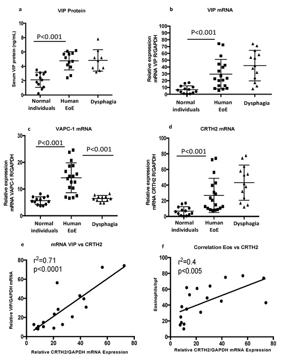 The gastrointestinal tracts of human and rodents, including the esophagus, exhibit the VIP-mediated relaxation of the lower esophageal sphincter [48]. We examined the induced blood VIP protein levels and esophageal biopsy mRNA levels of VIP and VIP receptors (VACP1 and CRTH) in dysphagia patients compared to normal individuals (normal vs. EoE, p < 0.001, n = 14–18; Figure 2b–d). We also statistically examined the correlation of VIP with CRTH2 receptor mRNA, p < 0.0001 (Figure 2e), and eosinophil count relative to CRTH2 receptor mRNA levels in the biopsies of EoE patients, (p < 0.005, n = 17–18; Figure 1f). r2 values were calculated using the Mann–Whitney test with the Bonferroni correction. Data on blood protein (n = 7–13) and mRNA (n = 13–18) levels are expressed as mean ± SD.