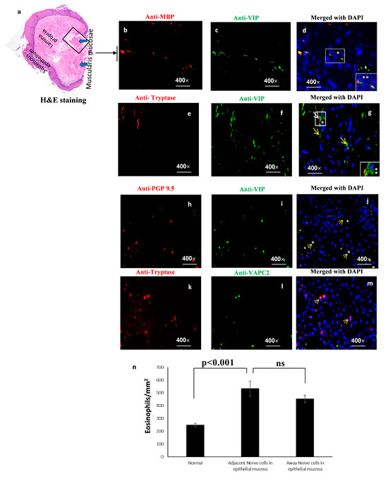 Immunofluorescence detection of eosinophils nearby nerve cells of epithelial mucosa in EoE patients. H&E staining of eosinophils in human EoE patients shows all segments including muscularis mucosa of deep esophageal biopsies (a). Anti-MBP-stained eosinophils and VIP nerve cells in the esophageal biopsies (stained red and green, respectively; (b–d)). Anti-PGP9.5-stained nerve cells and VIP are shown with low and high magnification in the esophageal biopsies of EoE patients (green and red, respectively; (e–g)). The DAPI-merged photomicrograph clearly shows the striking accumulation of anti-MBP-stained eosinophils nearby PGP 9.5-stained nerve cells in esophageal biopsies of EoE patients (d,g). Arrows indicate the recruitment of eosinophils nearby or on the nerve cells at low (100×; (d)) and high (400×; (g)) magnification of original photomicrographs of EoE biopsies. Double immunofluorescence of anti-tryptase and VIP was found in the epithelial mucosa of human EOE patient samples (h–j). Immunofluorescence of anti-tryptase and anti-PGP 9.5 was found in the epithelial mucosa of human EOE patient samples (k–m). Quantitation of eosinophils indicates that eosinophils accumulated nearby (distance < 1 μm) and away from (distance > 1 μm) nerve cells in the esophageal epithelial mucosa in EoE patients; no eosinophils were detected in control biopsies (n). ns—no significant. Data are expressed as mean ± SD, n = 6–7 patients, 3–4 hpf field, randomly selected biopsy sections.