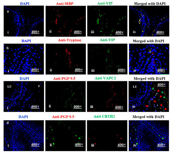 The activation and degranulation of eosinophils and mast cells have been implicated in the induction of esophageal functional abnormalities, including stricture and motility dysfunction, in human EoE [56]. Since the mechanistic and preclinical studies of esophageal function cannot be conducted on human EoE patients, we used a doxycycline (DOX)-exposed CC-10 IL-13 transgenic chronic EoE mouse model [57,58] generated by crossing two different transgenic mice using the construct presented in Supplementary Figure S3. We found that a similar VIP-associated mechanism is also operational for eosinophil and mast cell accumulation in and beyond the epithelial mucosa of an experimental DOX-regulated IL-13-overexpressed chronic mouse model of EoE. We showed that eosinophils and mast cells accumulated nearby VIP-expressed nerve cells (distance < 1 μm) from three weeks of DOX-exposed CC-10-IL-13 in the muscularis mucosa of a mouse model of experimental EoE. Eosinophils and mast cells also accumulated in the immunofluorescence staining of anti-MBP, anti-tryptase, and anti-VIP in muscularis mucosa in the tissue sections of DOX-exposed CC-10-IL-13 mice (Figure 6a(i–iv)). Previously, we showed that CC10-IL-13 mice accumulate eosinophils and mast cells in each segment of the esophagus [56]; here, we present evidence that these mice also accumulate eosinophils and mast cells near nerve cell-expressed VIP in the muscularis mucosa. A merged photomicrograph of DAPI-mounted anti-MBP and anti-VIP-stained tissue sections shows eosinophils nearby VIP-expressing nerve cells (Figure 6a(iv)) and anti-tryptase and anti-VIP mast cells nearby nerve cells in the esophageal tissue sections of our DOX-exposed CC-10-IL-13 mouse model of EoE (Figure 6b(i–iv)). Next, we stained these tissue sections with anti-PGP 9.5/anti-VAPC2 and anti-PGP 9.5/anti-CRTH2 and found the accumulation of VIP receptor-positive cells nearby nerve cells (Figure 6c(i–iv),d(i–iv)). Doxycycline’s short-term use has no effect on mice; its function is to induce a particular gene inserted to the promoter. WT mice exposed to DOX do not show any tissue pathological abnormalities, but changes in gut microbiome and insulin levels were observed after long exposure in transgenic mice [59,60]. These data confirm that this mouse model mimics human EoE and is suitable for investigating the mechanism underlying eosinophil and mast cell accumulation in tissue beyond the epithelial mucosa that promotes functional abnormalities, like motility disorders, in human EoE. Photomicrographs are presented at 400× original magnification.