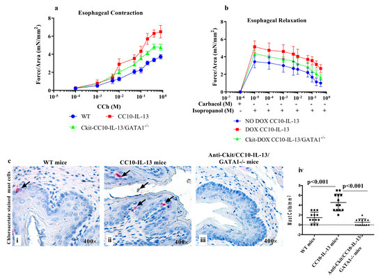We have shown that eosinophil-deficient ΔdblGATA-CD2-IL-5-overexpressed mice do not show improvement in esophageal longitudinal muscle contraction dysfunction [57]. Next, we examined whether both eosinophils and mast cell deficiency in a DOX-regulated CC10-IL-13 chronic mouse model of EoE improve the impaired esophageal longitudinal muscle contraction and relaxation compared to doxycycline (DOX)-exposed CC-10-IL-13 mice. It has been shown that CC10-IL-13-overexpressed mouse esophagus accumulates inflammatory cells associated with fibrotic responses in the esophagus [61] and that esophageal muscle contractility with chronic esophageal inflammation affects esophageal motility [57]. We generated DOX-regulated eosinophil-deficient ΔdblGATA-CC10-IL-13 transgenic mice by breeding ΔdblGATA mice with DOX-regulated CC10-IL-13 mice as described previously [58], and mast cells were neutralized by intraperitoneally injecting anti-C-kit antibody (CD117, clone 2B8, BioLegend, San Diego, CA, USA) 1 mg/mouse/week as per the protocol shown in Supplementary Figure S4A. We examined the carbachol-induced esophageal muscle contractility in CC-10-IL-13 mice exposed to DOX for 3 weeks, DOX-exposed C-kit-neutralized ΔdblGATA/CC-10-IL-13 mice with esophagi ex vivo, and in no-DOX-exposed CC-10-IL-13 mice. We observed that DOX-exposed CC10-IL-13 mice developed more force in esophageal muscle contraction in response to the cumulative additions of carbachol compared to C-kit-neutralized ΔdblGATA/CC-10-IL-13 (both eosinophil- and mast cell-deficient) mouse models of EoE, the latter of which showed significantly reduced force in contraction of esophageal muscles. No-DOX-exposed CC-10-IL-13 mice showed highly reduced force in response to carbachol (Figure 7a). We also examined 3-week-exposed DOX-regulated CC10-IL-13-overexpressed mice and C-kit-neutralized DOX-regulated ΔdblGATA/CC-10-IL-13 mice, with longitudinal esophagus muscles precontracted with carbachol to achieve the maximal response (6.5 ± 0.13 MN/mm2), then isoproterenol was cumulatively added as shown in Figure 7b. We observed that the relaxation of isometric force on the esophageal smooth muscle of DOX-exposed C-kit-neutralized ΔdblGATA/CC10-IL-13-overexpressed mice was significantly reduced compared to CC10-IL-13-overexpressed mice. Both DOX-regulated CC10-IL-13-overexpressed mice and C-kit-neutralized ΔdblGATA/CC10-IL-13-overexpressed mice showed esophageal relaxation in response to isoproterenol in a concentration-dependent manner (Figure 7b). Staining tissue sections with chloroacetate esterase revealed that anti-c-Kit-neutralized eosinophil-deficient IL-13-overexpressed (ΔdblGATA/CC10-IL-13) mice are also deficient in mast cells compared to WT or CC10 IL-13-overexpressed mice (Figure 7c(i–iv)). This suggests that the accumulation of both eosinophils and mast cells is responsible for motility dysfunction in EoE. Data are expressed as mean ± SEM; n = 3 experiments.