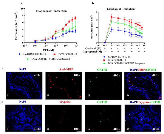We have shown that both eosinophils and mast cells express VIP receptor CRTH2, and in vitro CRTH2 antagonists restricted the migration of both eosinophils and mast cells. Thus, we decided to determine whether the pharmacological CRTH2 receptor antagonist treatment of eosinophils improves esophageal longitudinal muscle contraction and relaxation dysfunction in DOX-inducible CC10-IL-13 mice. We examined the effect of ex vivo CRTH2 antagonist treatment on motility in esophagi of DOX-inducible CC10-IL-13 mice in response to the cumulative additions of carbachol (CCh) and isoproterenol (ISO), respectively. Our analysis indicated that the esophagi of CC10-IL-13 mice exposed to DOX for 3 weeks developed more force in esophageal muscle contractility in response to cumulatively increased carbachol concentrations, compared with CRTH2 antagonist-treated DOX-exposed CC10-IL-13 mice (Figure 8a). This carbachol-induced contractility suggests a concentration-dependent force that is reduced following CRTH2 antagonist treatment. The maximum contractility isometric force of 7.23 ± 0.15 mN/mm2 for this group was significantly greater than that of the CRTH2 antagonist-treated CC10-IL-13 mice, (4.71 ± 0.24 mN/mm2). No-DOX CC10-IL-13-overexpressed mice showed highly reduced force in response to contractility, suggesting a concentration-dependent force that is reduced following CRTH2 antagonist treatment. The maximum contractility isometric force of 7.23 ± 0.15 mN/mm2 was significantly greater than that of the CRTH2 antagonist-treated CC10-IL-13 mice, (4.71 ± 0.24 mN/mm2). No-DOX CC10-IL-13-overexpressed mice showed highly reduced force in response to carbachol (Figure 8a). The longitudinal preparations of esophageal muscles were precontracted with carbachol to achieve 6.3 ± 0.39 mN/mm2 of the maximal response. Following the cumulative additions of isoproterenol, the relaxation of isometric force in esophageal smooth muscle from CRTH2 antagonist-treated DOX-exposed CC10-IL-13-overexpressed mice showed significantly reduced muscle relaxation compared to CC10-IL-13-overexpressed mice. Both no-DOX-regulated CC10-IL-13-overexpressed mice and CRTH2 antagonist-treated CC10-IL-13-overexpressed mice showed significantly reduced esophageal longitudinal muscle isometric tension in response to isoproterenol (Figure 8b). This indicates that CRTH2 antagonist treatment may be a promising treatment strategy to improve motility dysfunction in EoE. The immunofluorescence analysis of eosinophils expressing CRTH2 and mast cells expressing CRTH2 were examined, and the expression is shown in the esophageal tissue sections of CC10-IL-13-overexpressed mice (Figure 8c(i–iv),d(i–iv)).