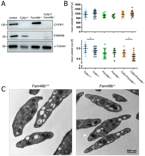 Platelet biogenesis of Cyfip1−/−, Fam49b−/−, and Cyfip1/Fam49b−/− mice. (A) Expression of the indicated proteins in control and mutant platelets was assessed by Western blot analysis with α-Tubulin serving as loading control (n = 3). (B) Platelet count per microliter and platelet size, assessed by hematology analyzer (n = 7–17). Values are presented as mean plus or minus standard deviation (SD). Asterisks indicate * p ≤ 0.05. p values > 0.05 were rated as not significant. (C) Transmission electron microscopy of Fam49b−/−-platelets reveals no obvious differences in the platelet ultrastructure compared to control cells.