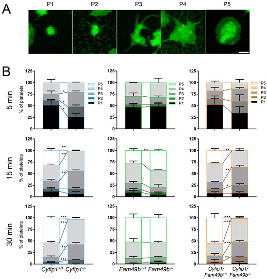 Differential spreading of isolated Cyfip1−/−-, Fam49b−/−-, and Cyfip1/Fam49b−/−-platelets on fibrinogen-coated surfaces. (A) Representative fluorescence images of different phases of spreading of wildtype platelets. Cell membranes were stained using Membright488. Scale bar: 1 µm. (B) Quantification of the different spreading phases of platelets fixed after 5, 15, and 30 min. Platelets mutated in Cyfip1 were unable to reach spreading phase 5. Analyzed cells per genotype: n5min > 200; n15min > 400; n30min > 700. Asterisks indicate * p ≤ 0.05; ** p ≤ 0.01; *** p ≤ 0.001. p values > 0.05 were rated as not significant.