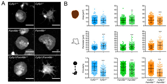 3.3. Spread Fam49b−/− Platelets Display a Reduced Circularity