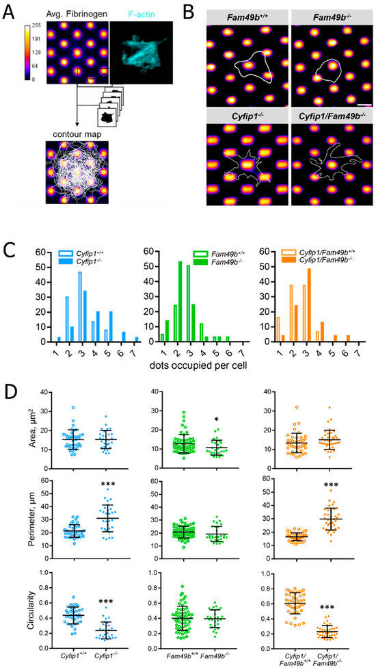 To assess the morphology of spreading platelets under conditions closer resembling the in vivo platelet microenvironment, we generated surfaces with an anisotropic distribution of fibrinogen (2D structured micropatterns of fibrinogen) using a maskless photopatterning system (Figure 5A). A dotted structure was chosen to examine how platelet spreading is affected on minimally anisotropically distributed ligand spots. The dot size and distance were determined based on the resolution limit of the micropatterning system. Based on the cell contours (Figure 5B), we then quantified the number of dots occupied by each platelet as a measure of spreading efficiency. As seen in Figure 5C, the majority of control platelets occupied three dots. However, platelets lacking CYFIP1 were able to engage a higher number of fibrinogen-coated dots, with the majority of Cyfip1−/− and Cyfip1/Fam49b−/− cells occupying three up to seven dots (~70%, Figure 5C, blue and orange bars). This finding suggests that a platelet phenotype characterized by abundant filopodia formation might be advantageous for spreading on surfaces with anisotropic ligand density. In contrast, the majority of Fam49b−/− platelets only connected to <3 dots (~68%, Figure 5C, green bars), indicating that the lack of negative WAVE regulation via FAM49b may be disadvantageous for platelet spreading on a nonuniformly coated fibrinogen surface. Interestingly, the cell area, perimeter, and circularity of Cyfip1−/− and Cyfip1/Fam49b−/− platelets spread on micropatterns closely resembled the respective parameters of Cyfip1−/− and Cyfip1/Fam49b−/− platelets spread on fully-coated fibrinogen surfaces (Figure 4B), indicating unimpeded platelet spreading when challenged by anisotropic ligand distribution.