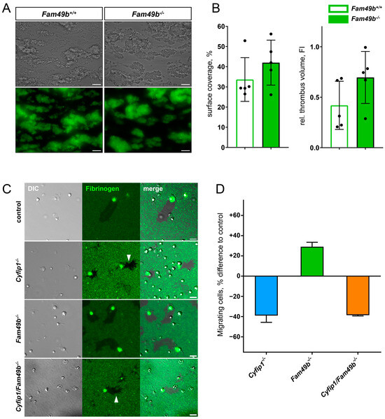 The lack of lamellipodia formation was shown to be dispensable for thrombus formation [10]. Next, we investigated whether the increased lamellipodia formation of Fam49b−/− platelets affects thrombus growth. As seen in Figure 7A, both Fam49b+/+ and Fam49b−/− platelets rapidly adhered to collagen and formed stable thrombi. Yet, neither the surface coverage nor the thrombus volume of Fam49b−/− samples differed significantly from controls, indicating that thrombus formation is not altered by FAM49b deficiency (Figure 7B). However, lack of FAM49b was already reported to increase cell migration in other cell types [12], and downregulation of FAM49 was shown to enhance the invasiveness and migration of cancer cells [14,24]. However, the role of FAM49b in platelet migration is unclear. Thus, we assessed the migration (i.e., motility) of Cyfip1−/−, Fam49b−/−, and Cyfip1/Fam49b−/− platelets on fibrinogen-coated surfaces. As seen in Figure 7C, the area cleared by migrating control and Fam49b−/− platelets showed smooth edges, indicating lamellipodia-driven cell migration. In contrast, the areas cleared by Cyfip1−/− and Cyfip1/Fam49b−/− platelets displayed fuzzy edges (Figure 7C, arrows), consistent with cells primarily engaging their microenvironment via outgrowth of filopodia. These findings agree with our morphological analyses of platelets spread on fully-coated fibrinogen surfaces (Figure 4). To assess the migratory potential of the Cyfip1−/−, Fam49b−/−, and Cyfip1/Fam49b−/− platelets, we then quantified the number of migrating cells in relation to all adherent, spread platelets compared to the percentage of migrating cells in the respective controls (Figure 7D). Interestingly, the percentage of migrating Fam49b−/− platelets was increased by 29.08% (±4.35), whereas migration of Cyfip1−/− and Cyfip1/Fam49b−/− platelets was reduced by ~38% [11]. Thus, our analysis suggests that FAM49b negatively regulates platelet migration in the presence of a stable WAVE complex.