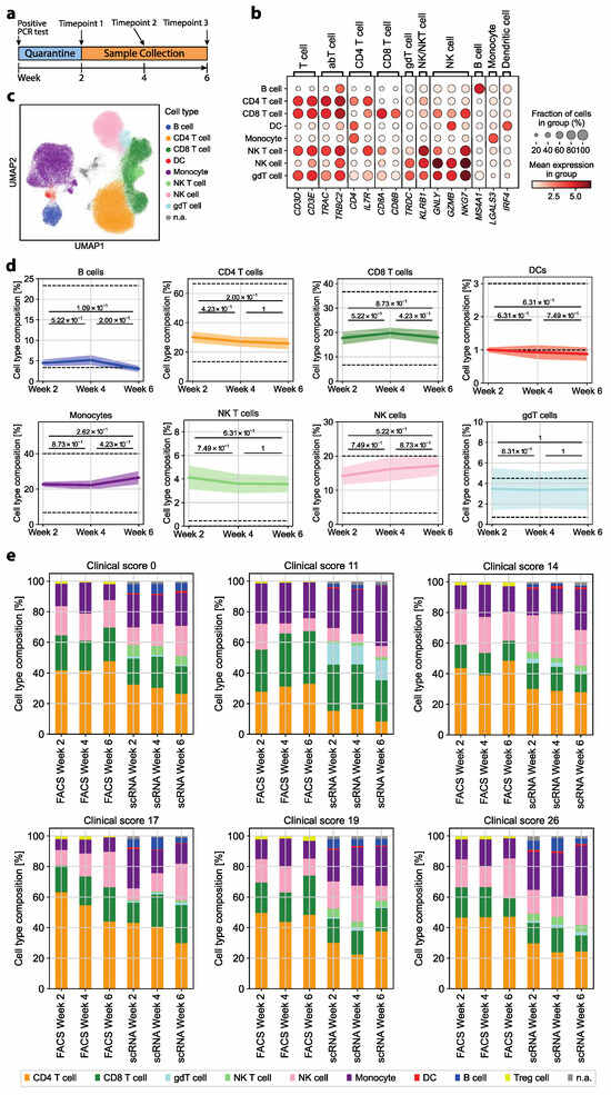 Convalescent COVID-19 patients show longitudinal stability in the relative frequency of immune cell types from the blood. (a) Timeline of patient sample collection. (b) Mean log-normalized marker gene expression for each of the assigned cell types and not annotated (n.a.) cells. (c) UMAP representation of all cells after preprocessing with coloring of the assigned cell type for each cell. A total of 1345 cells were n.a. due to ambiguous marker gene expression. (d) Relative cell type frequency among all cells over time. The mean relative frequency of all patients ± standard error is shown. For each pair of time points, a two-sided Wilcoxon rank sum test was performed. The dashed line indicates the range of physiological variation in the relative cell type frequency for the respective cell type. (e) Cell type composition of each patient over time based on marker gene annotation for scRNA-seq or differential gating by flow cytometry.