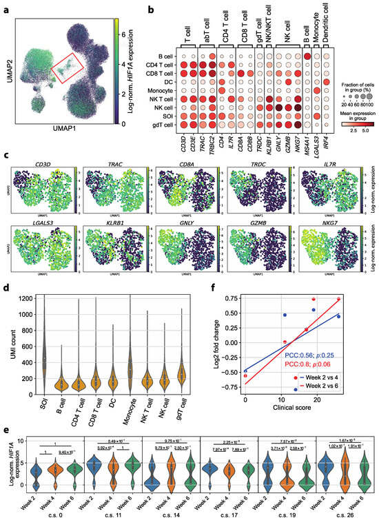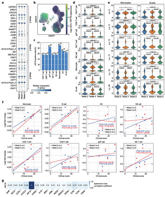 Multiple immune cell lineages also showed altered HIF1A expression at week 2 compared to later time points, despite containing quantitatively fewer HIF1A-expressing cells compared to monocytes. HIF1A expression in week 2 was significantly upregulated compared to that in week 4 in CD4+ T cells, CD8+ T cells, NK cells, monocytes and B cells. All analyzed cell types except for NK T cells and γδ T cells expressed HIF1A at significantly higher levels in week 2 than in week 6. In addition, a significant upregulation was observed in CD8+ T cells, NK cells and dendritic cells in week 4 compared to week 6 (Figure 3d).