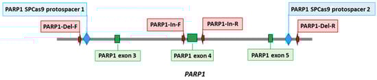 Here, PARP1 knockout HEK293FT clones (HEK293FT/P1-KO) were generated essentially as previously described for PARP1 knockout HEK293A cells []. The positions of protospacers for the deletion of a DNA sequence including 3–5 exons of the PARP1 gene, which encode a part of the DNA-binding domain, as well as primer sequences for the detection of deletions are shown in the schema (Figure 1).