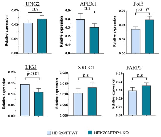 qPCR analysis of relative expression of mRNAs coding for the key SP BER proteins in HEK293FT WT and HEK293FT/P1-KO cells: UNG2, APEX1, Polβ, XRCC1, LIG3, and PARP2. The data are expressed as the mean ± standard deviation of at least three independent experiments; n.s.: not significant.