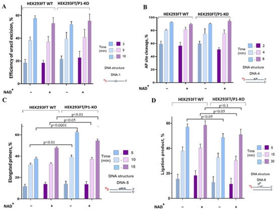Efficiency of the BER reactions catalyzed by endogenous enzymes from the WCEs of HEK293FT WT and HEK293FT/P1-KO cells. (A): uracil excision from single-stranded substrate DNA; (B): cleavage of an AP site; (C): elongation of a primer; (D): ligation of a nick. The data are expressed as the mean ± standard deviation of at least three independent experiments.