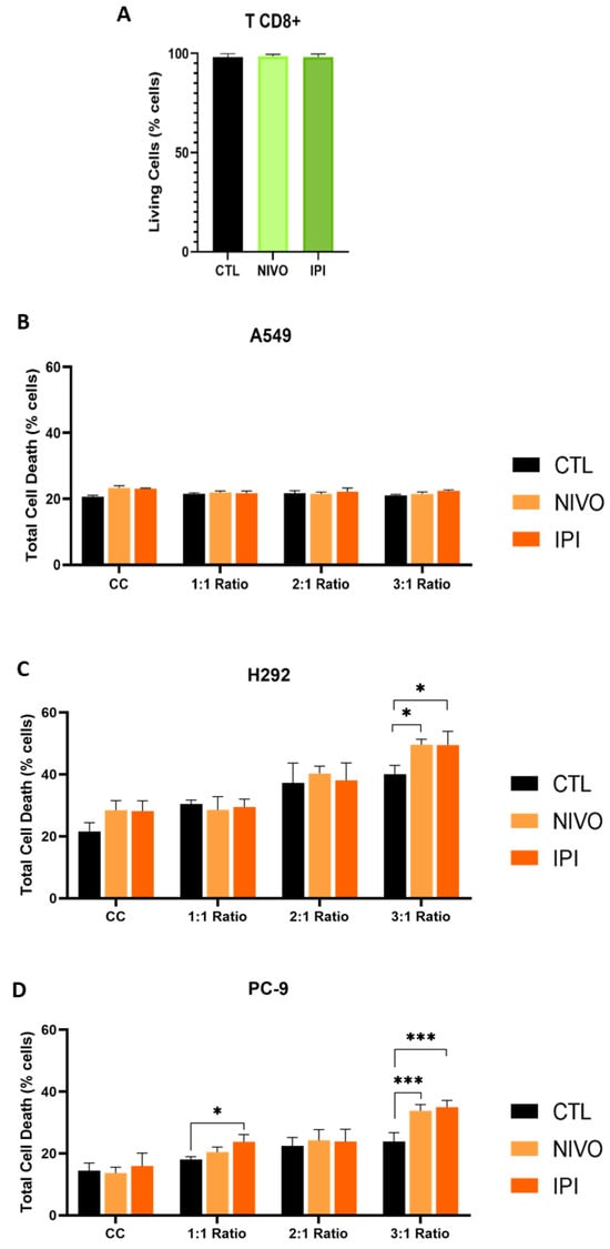 Nivolumab and Ipilimumab affect viability of H292 and PC-9 cells in the presence of TCD8+. NSCLC cells were co-cultured with TCD8+ in different TCD8+: cancer cell ratios (1:1, 2:1 and 3:1). The cells were cultured in control (CTL), Nivolumab (NIVO) and Ipilimumab (IPI) conditions. Cell death was evaluated by flow cytometry (N = 3). (A) Nivolumab and Ipilimumab did not affect viability of TCD8+. (B) A549 cell death was not affected by the experimental conditions. In cell lines H292 (C) and PC-9 (D), Nivolumab and Ipilimumab caused a significant increase in cell death in 3:1 ratio co-culture. Results are represented as mean ± SD. * p < 0.05, *** p < 0.001. For (A), unpaired t-tests were used. For (B–D), two-way ANOVAs were used with Tukey’s test. CC: cancer cells (monoculture).