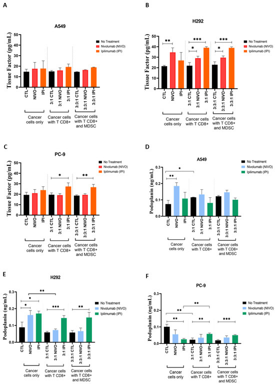 Tissue factor (TF) and Podoplanin (PDPN) protein levels are differently affected by treatment with ICIs in NSCLC cell lines. Culture supernatants’ analysis of TF and PDPN proteins by enzyme-linked immunosorbent assay (ELISA) (N = 3). (A) In cultures with A549 cells, TF levels were only slightly higher with Nivolumab and Ipilimumab exposure (compared to the respective controls). (B) In cultures with H292 cells, TF levels were increased in co-cultures with TCD8+ that were treated with both ICIs. (C) In cultures with PC-9 cells, treatment with Ipilimumab increased TF levels in the presence of TCD8+. (D) In cultures with A549 cells, PDPN levels were only slightly decreased in the presence of TCD8+ and the ICI (compared to monocultures). (E) With H292 cells, co-cultures with TCD8+ that were treated with ICIs showed an increase in PDPN protein. (F) In cultures with PC-9 cells, TCD8+ presence induced a small decrease in PDPN with Nivolumab, but an increase was seen with Ipilimumab. Results are shown as mean ± SD. * p < 0.05, ** p < 0.01, *** p < 0.001. Unpaired t-tests were used.
