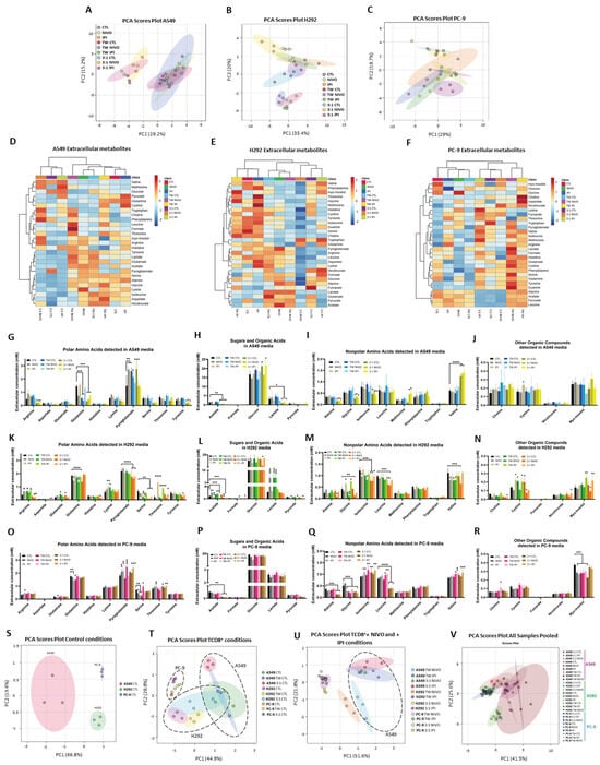 Exometabolome of NSCLC cells is affected by TCD8+ and ICI treatment. The cell culture media were analyzed by nuclear magnetic resonance (NMR) in order to study the exometabolome of the TME and detect metabolic variations between CTL, NIVO, IPI, 3:1 CTL, 3:1 NIVO and 3:1 IPI conditions (N = 3). A principal component analysis (PCA) was conducted to classify the samples, and the scores plots illustrate clustering patterns from the exometabolome profiles of samples from A549 (A), H292 (B) and PC-9 (C) cell lines. Heatmaps showing the concentrations of extracellular metabolites in A549 (D), H292 (E) and PC-9 (F) cell lines. Concentration data in the heatmaps represent the average values obtained from the replicates of the experimental conditions. Heatmaps color codes represent the relative fold change of each metabolite between classes, being red and blue colors increased or decreased levels, respectively. Euclidean distance measure and the Ward cluster algorithm were used for the heatmaps analysis, using MetaboloAnalyst 5.0 software. The levels of the 27 metabolites identified in A549 cultures media were organized into polar amino acids (G), sugar and organic acids (H), nonpolar amino acids (I) and other organic compounds (J). The levels of the 28 metabolites identified in H292 cultures media were organized into polar amino acids (K), sugar and organic acids (L), nonpolar amino acids (M) and other organic compounds (N). The levels of the 28 metabolites identified in PC-9 cultures media were organized into polar amino acids (O), sugar and organic acids (P), nonpolar amino acids (Q) and other organic compounds (R). A principal component analysis (PCA) was conducted to classify the samples, and the scores plots illustrate clustering patterns considering the levels of acetate, pyruvate, glutamine, glycine, valine, leucine and isoleucine in samples from A549 (S), H292 (T) and PC-9 (U) cell lines individually and pooled together (V). Represented in the graphics (G–R) is the statistical analysis, for each metabolite detected, of the different treatment conditions compared to the control condition. * p < 0.05, ** p < 0.01, *** p < 0.001, **** p < 0.0001. One-way ANOVA was used, followed by Tukey’s test. TW: TransWell conditions (indirect co-cultures).
