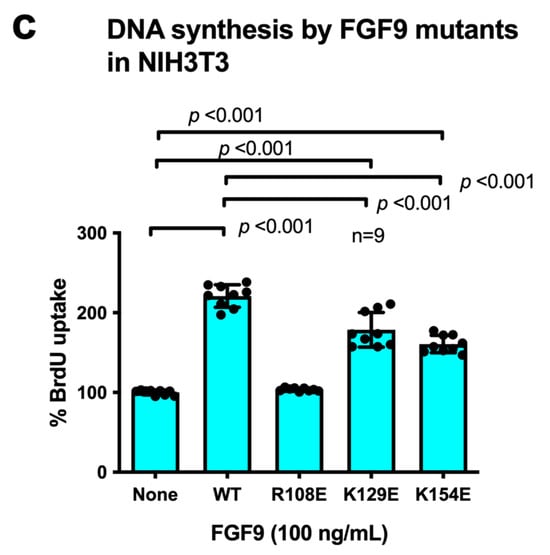 3.4. R108E Suppresses Activation of FRS2 and ERK1/2 and DNA Synthesis Induced by WT FGF9 (Dominant-Negative Effect) in NIH3T3 Cells