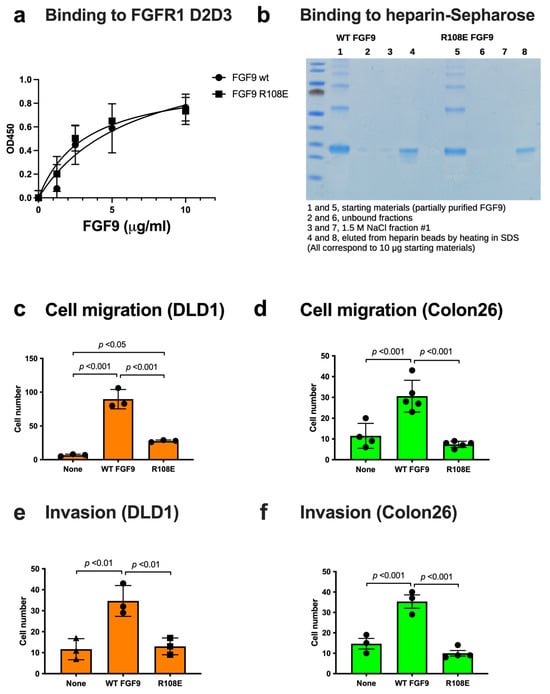 Invasion assays were performed in a filter of 8 µm pore size in the Chemotaxicell chamber coated with 100 µg/mL growth factor-reduced Matrigel (BD Biosciences, San Jose, CA, USA) for 3 h at 37 °C and blocked with 0.1% bovine serum albumin in PBS. Cells were suspended in serum-free DMEM containing 0.1% BSA and plated in the upper chamber. The lower chamber was filled with DMEM containing 0.1% BSA and 50 ng/mL recombinant human WT FGF9 or R108E FGF9. Then, cells were allowed to migrate for 24 h. The top side of the filters was wiped with cotton swabs, fixed, and stained with 0.1% crystal violet. Images were taken by a digital camera and counted using the cell-counting function of Image J software (version 1.50).