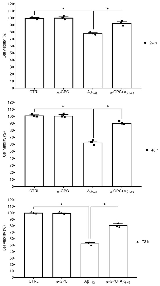 α-GPC mitigates the Aβ1–42-induced detrimental effect on BV2 microglial cells. The cell viability (%) of BV2 microglial cells pre-treated for 1 h with α-GPC (1 μM) and treated for 24, 48, or 72 h with Aβ1–42 (5 μM). The vertical bars represent the means ± S.E.M. One-way ANOVA and the Bonferroni post-hoc test were used for statistical analysis. * p < 0.05.